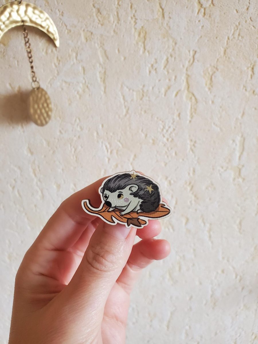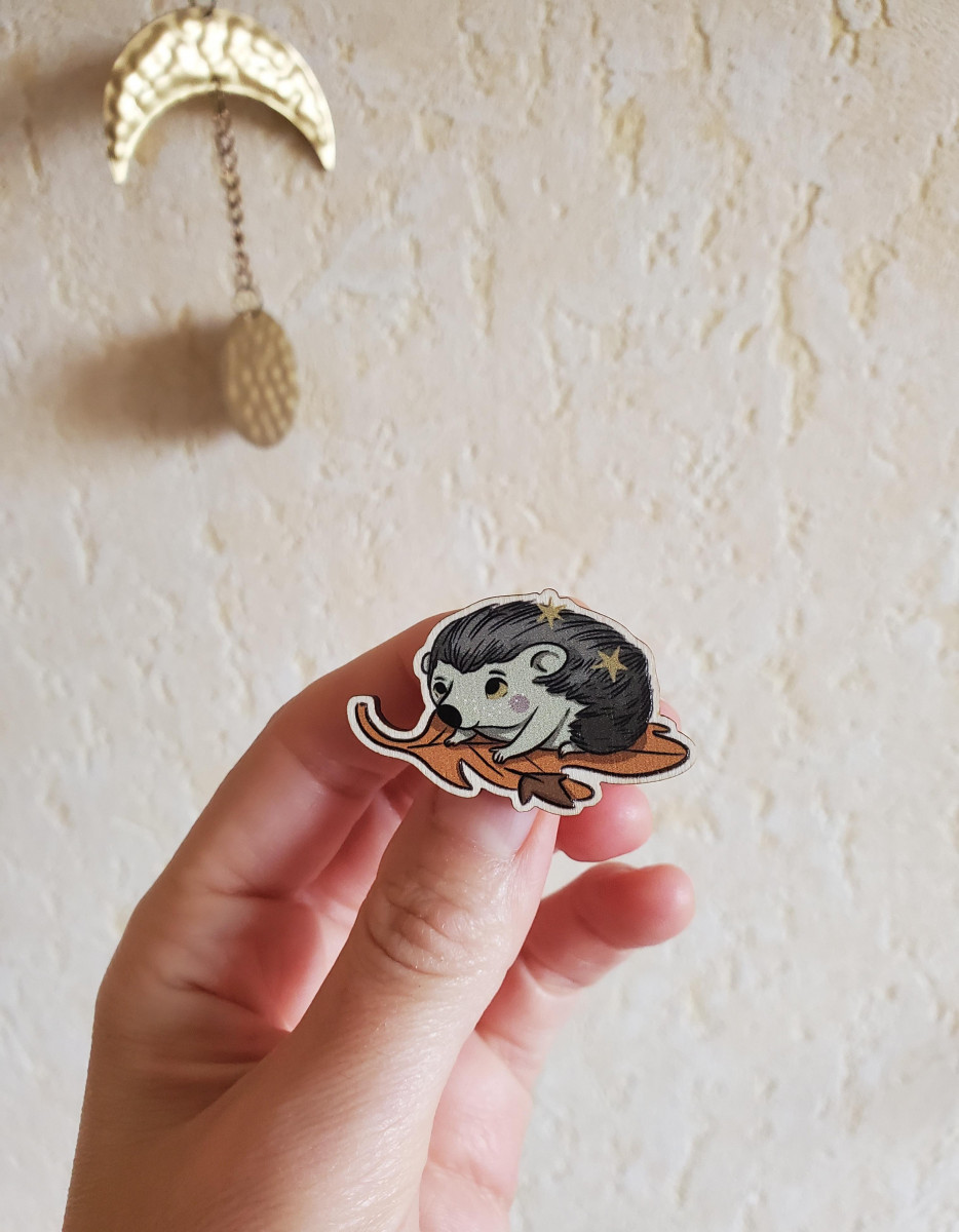 Broche en bois illustrée hérisson pour accompagner ta meilleure veste ou ta plus belle robe witchy.