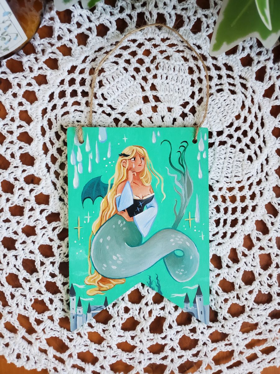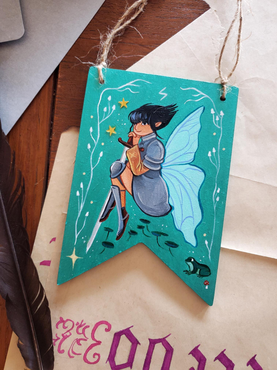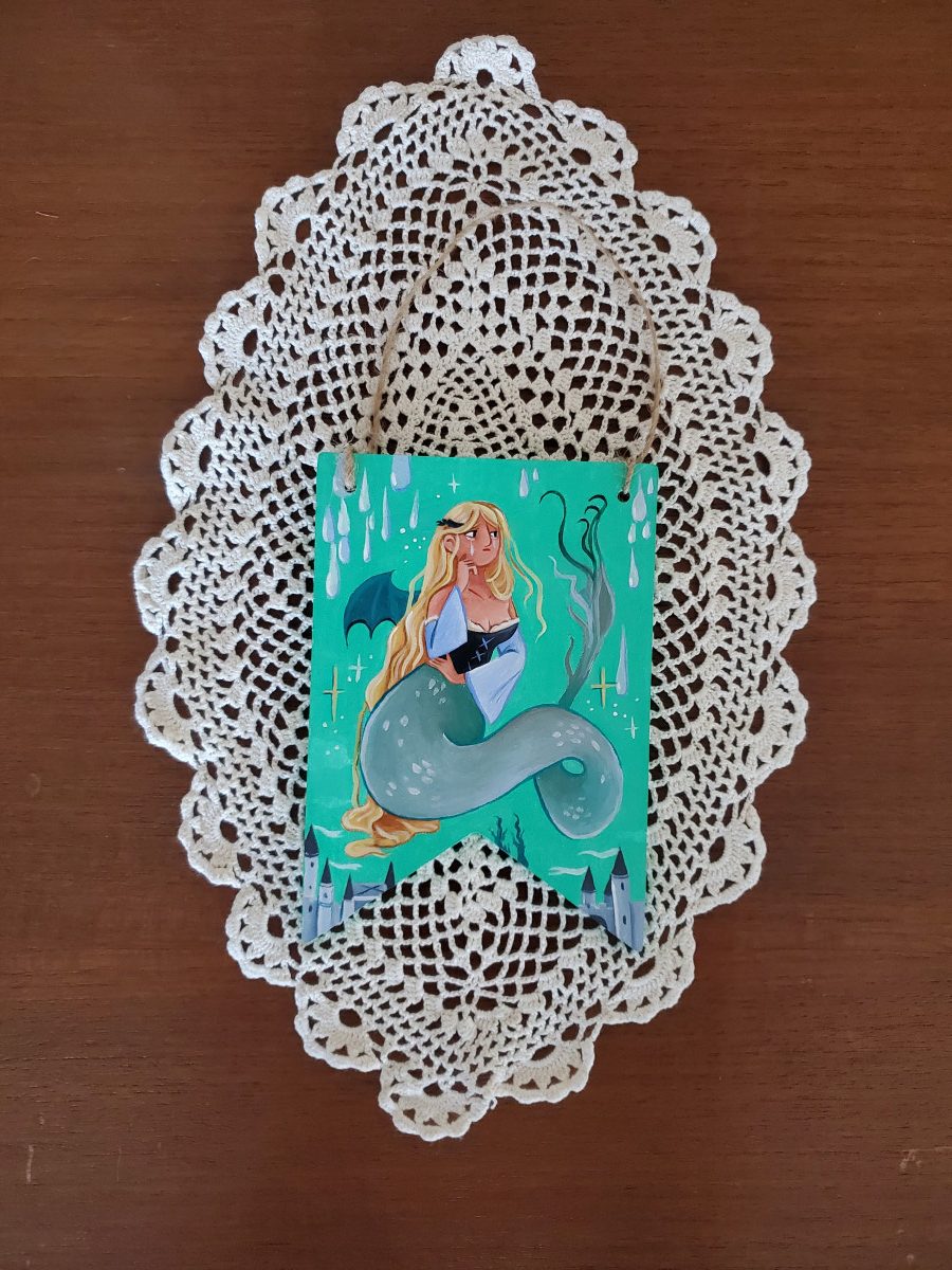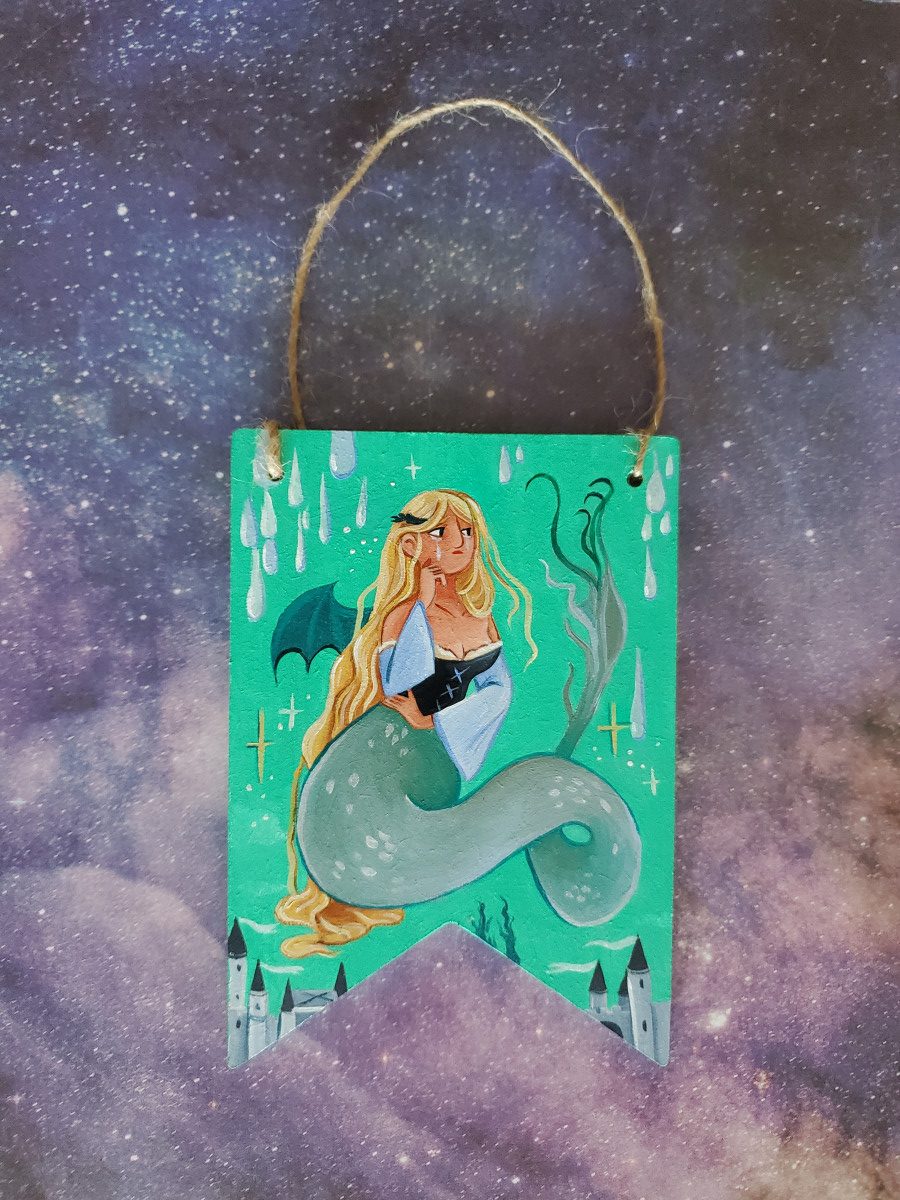 Décoration médiévale fanion à accrocher, peinture sur bois à l’acrylique, 10-14 cm de hauteur environ, Mélusine la fée.